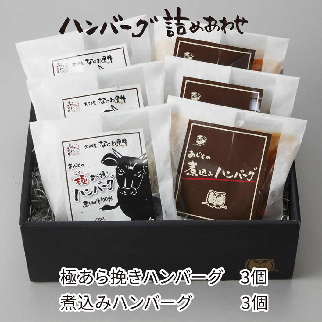 【内容量】 なにわ黒牛100%極あら挽きハンバーグ×3個 黒毛和牛と鹿児島県産豚肉の煮込みハンバーグ×3個